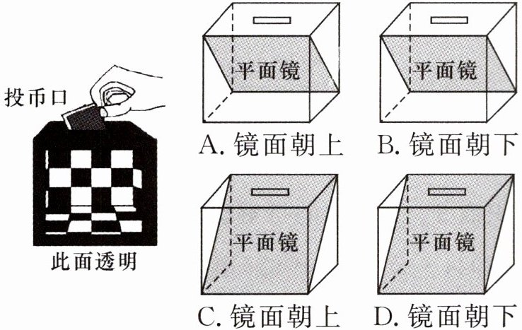 10. 小明在科技节中表演魔术:从投币口投入只有正面透明的棋盘格空箱的硬币消失了!随后他揭秘:这是平面镜和棋盘格共同形成的结果。下列放置平面镜的方式能实现这个魔术效果的是(
