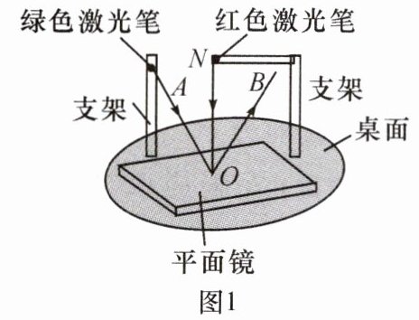 2. (2024·贵阳白云区期末)为验证光的反射定律,小刚准备了两支不同色光的激光笔、平面镜和固定激光笔的支架,组装为如图1所示实验装置,将该装置放在水平桌面上。打开激光笔后,绿光斜射到平面镜上的O点,红光垂直照射到O点。请回答下列问题:
