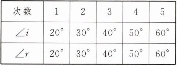 (3)小浩多次改变光束入射的角度,测量ON两侧的入射角i和反射角r,并将数据记录在表格中,根据表中数据可得出结论:在光的反射中,