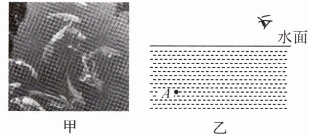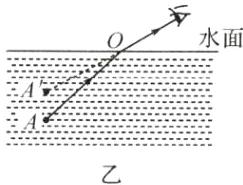 13. (2025·黔南州一模)黔南荔波小七孔景区被誉为“地球腰带上的绿宝石”,是国家5A级景区,也是世界自然遗产地的一部分。这里风景如画,翠绿山林与碧水蓝天相映成趣,宛如人间仙境。如图甲所示是游客拍摄的游鱼在水中游动时的场景,请在图乙中画出岸上的人看到水中A处鱼的大致光路。(保留作图痕迹)