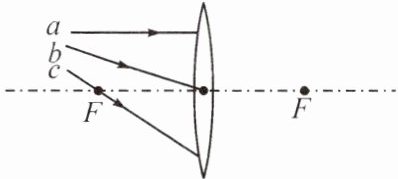 13. (1) 如图,$ F $ 是凸透镜的焦点,$ a $、$ b $、$ c $ 是三条入射光线,请画出这三条光线经凸透镜后的出射光线。