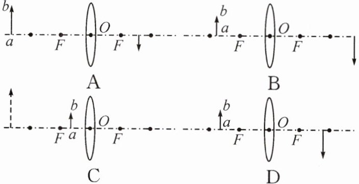 4. 如图,透过水滴我们看到了远处颠倒过来的树木和房屋。下列选项图中线段 $ ab $ 表示物体,能正确反映其成像原理的示意图是(