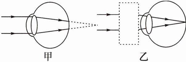 7. 图甲是某人眼睛观察某物体的成像示意图,请在图乙中的虚线框内画上适当的透镜,使该物体能成像在视网膜上。
