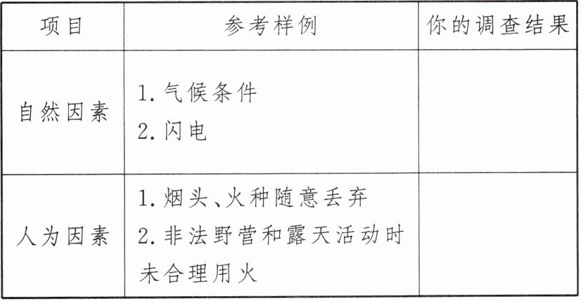 1. 要有可燃物。日常生活中常见的可燃物有:木材、天然气、石油等;你知道森林中有哪些易燃物体吗?