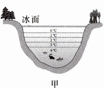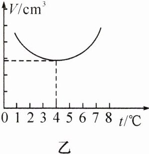 8. A|人大附中校本经典题(多选)图甲为北方冬天湖水温度分布示意图,图乙为一定质量的水的体积在$0\sim 8\ °C$范围内随温度变化的图像,根据图像及水的其他性质,下列分析判断正确的是(
