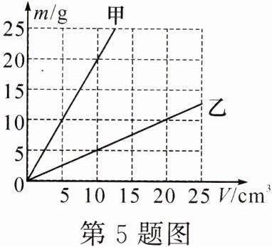 5. 如图所示是甲、乙两种物质的质量与体积关系图像,分析图像可知 (