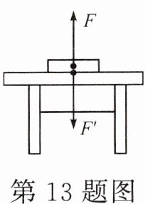 13. 如图所示,一本书放在桌面上,书受到桌面的支持力为 $ F $,这个力的施力物体是