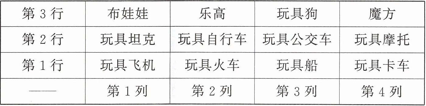 三、同学们玩套圈游戏,下面是各种玩具的摆放位置。