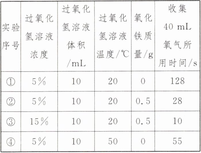 10. [科学探究与实践]为了探究氧化铁能否作过氧化氢溶液分解的催化剂,同学们设计了实验装置并进行了气体的制取和测量实验。实验时均以生成 40 mL 气体为标准,相关实验数据记录如下表。