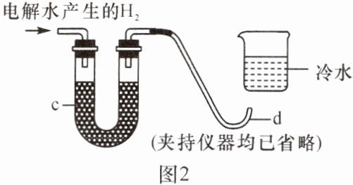 (4)科学家还用点燃氢气、通过证明燃烧产物的方法证实了水的组成。电解水产生的氢气中会混有水蒸气,首先将其缓缓地通过装有足量无水硫酸铜的仪器c,在导管口d处点燃,然后把盛有冷水的烧杯置于如图2所示的位置。实验过程中可以观察到的现象是