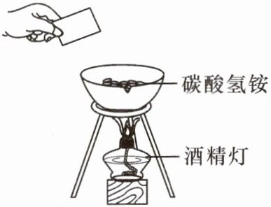 10. 取少量碳酸氢铵固体粉末放入蒸发皿中,将蒸发皿放在酒精灯上加热(如图所示)。