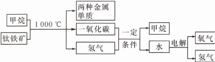 (1)混合物 $+4$ (2)增大反应物间的接触面积,使反应更快、更充分 (3)$\mathrm{F}\mathrm{e}\mathrm{T}\mathrm{i}{\mathrm{O}}_{3}+3\mathrm{C}{\mathrm{H}}_{4}\xlongequal{1000{\hspace{0pt}}^{\circ }\mathrm{C}}\mathrm{F}\mathrm{e}+\mathrm{T}\mathrm{i}+3\mathrm{C}\mathrm{O}+6{\mathrm{H}}_{2}$ (4)$\mathrm{C}\mathrm{O}+3{\mathrm{H}}_{2}\xlongequal{一定条件}\mathrm{C}{\mathrm{H}}_{4}+{\mathrm{H}}_{2}\mathrm{O}$ (5)$\mathrm{C}{\mathrm{H}}_{4}$、${\mathrm{H}}_{2}$