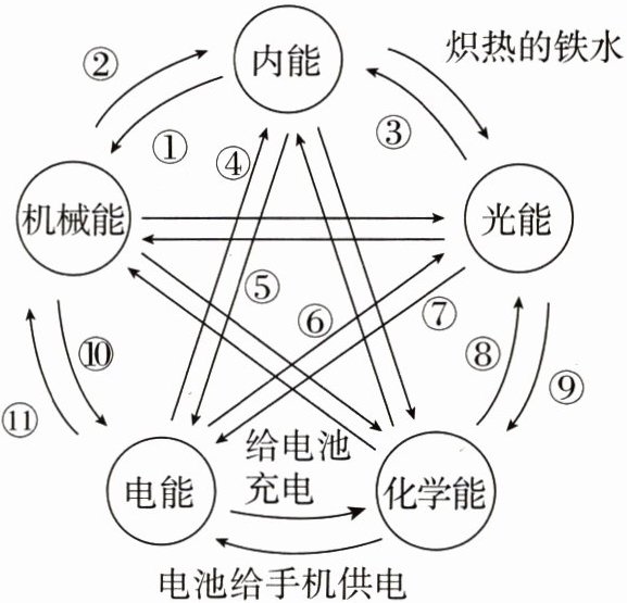 ①喷气发动机 ②摩擦生热 ③太阳能热水器 ④电饭锅 ⑤火力发电站 ⑥电灯 ⑦太阳能电池 ⑧蜡烛燃烧 ⑨光合作用 ⑩水力发电 ⑪电动机 (示例合理即可)
