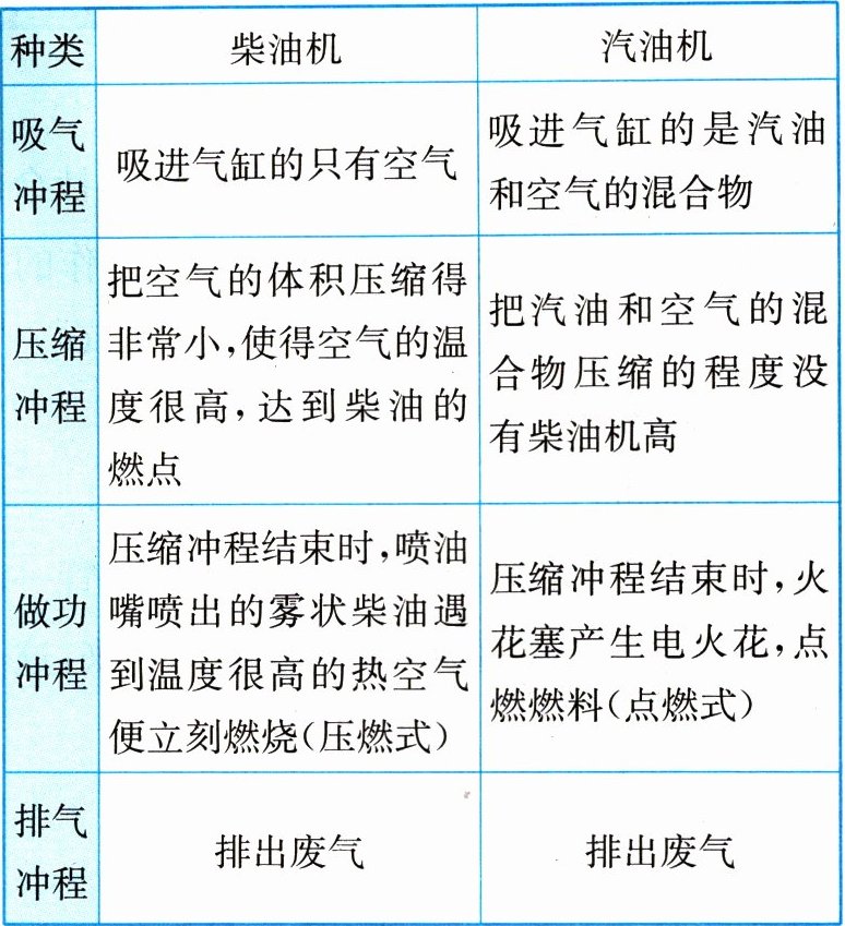 | 压缩冲程 | 把空气的体积压缩得非常小,使得空气的温度很高,达到柴油的燃点 | 把汽油和空气的混合物压缩的程度没有柴油机高 |