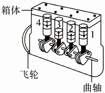 9. 四缸发动机示意图如图所示,其工作原理为:四个气缸的活塞连在一根曲轴上,并使各气缸的做功过程错开,在飞轮转动的每半周里,都有一个气缸在做功,其他三个气缸分别在做吸气、压缩和排气工作。有一台四缸发动机,其主要技术指标如下表所示。其中,排量等于四个气缸工作容积的总和,气缸工作容积指活塞从气缸顶部到底部所扫过的容积,又称单缸排量,它取决于活塞的面积和活塞上下运动的距离。转速表示 1 min 曲轴或飞轮所转的周数。