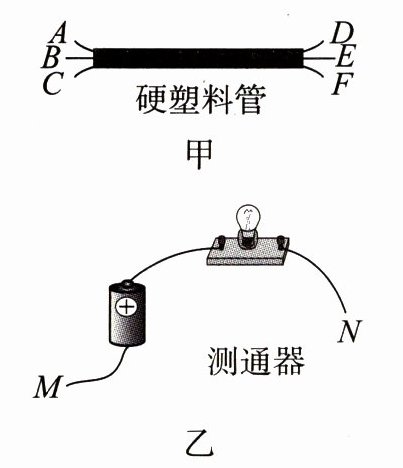8. 如图甲所示,在一根横跨河流两岸的硬塑料管内穿有三根完全相同的电线。为了辨别哪两个线头为同一根导线的两端,小聪设计了如图乙所示的测通器来测试,其操作过程如下。