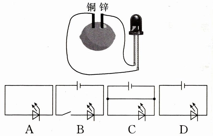 3. (广西中考)下图是水果电池和发光二极管( )组成的电路。下列电路图与其对应的是(