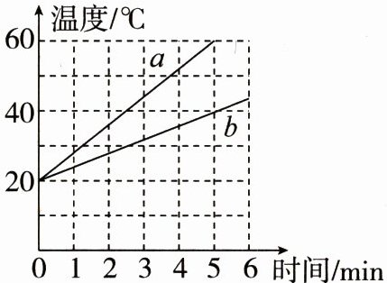 6. (烟台中考)在探究物质的吸热能力与哪些因素有关的实验中,用质量是$0.3kg$的水和下表中等质量的另一种物质进行对比,作出的图像如图所示。实验过程中,水和另一种物质在相同时间内吸收的热量相等,分析图像可以得出图线______(选填“$a$”或“$b$”)对应的物质为水,另一种物质为______,这种物质在$0~5min$内吸收的热量为______J。
