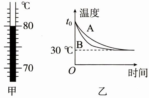 4. (镇江中考)为比较$A$、$B$两保温杯的保温性能,小红在两个保温杯中分别倒入$0.1kg$相同温度的热水,用温度计测量其初温$t_{0}$,示数如图甲所示,$t_{0}= $