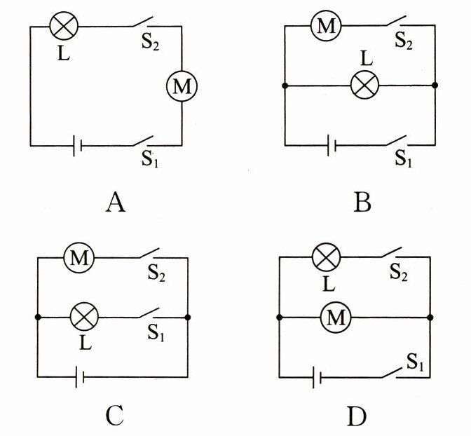 5. (南充中考)某校科创小组为“共享助力车”的安全头盔设计以下方案:扫码成功后开关$S_1$闭合,指示灯L亮;从车头取出头盔并戴上后,头盔内遥控设备遥控$S_2$闭合,电动机通电工作;扫码且戴头盔才能骑行。下列电路符合以上设计要求的是(