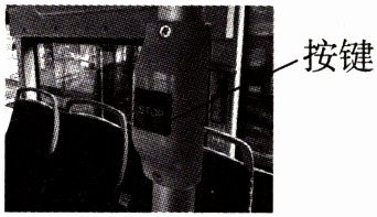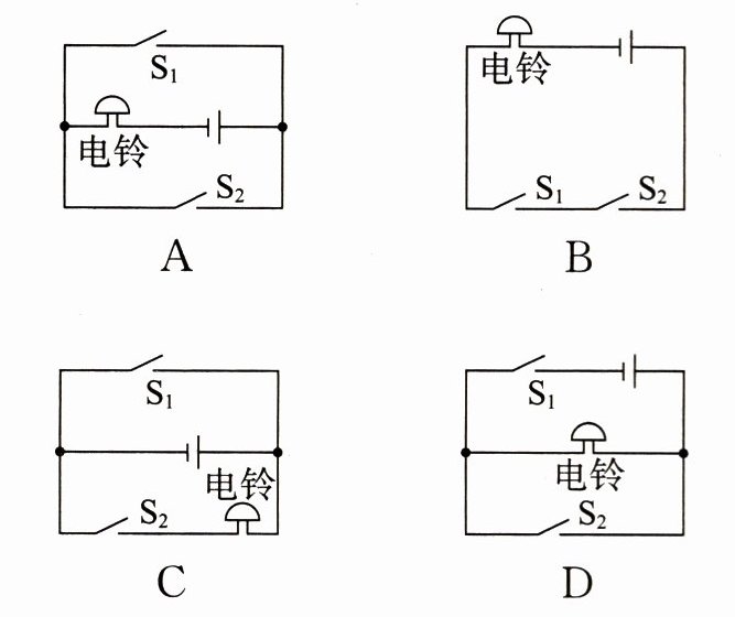 4. 小东乘坐公交车时发现:公交车后门左右两侧的扶手上,各安装了一个标有“STOP”的红色按键(如图),当乘客遇到紧急情况时,只要按下其中任意一个按键,公交车内的警示电铃就会响起。小东根据上述功能设计了四个简化模拟电路图,其中正确的是(