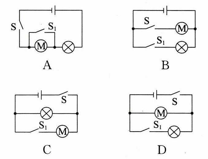 4. (遂宁中考)如图所示的电动独轮车依靠电力驱动,低碳环保。当电源开关S闭合时指示灯亮起,独轮车处于待机状态,当人站在独轮车上时开关$S_1$自动闭合,电动机工作,独轮车才开始运动。下列电路设计符合上述要求的是(