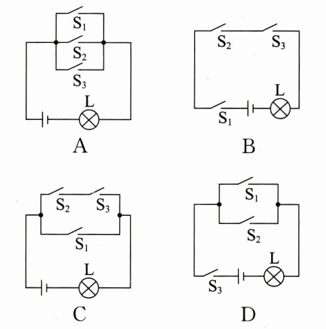 4.(枣庄中考)常用智能手机是通过指纹开关$S_1或密码开关S_2$来解锁的,若其中任何一种方式解锁失败后,则锁定开关$S_3$均会断开而暂停手机解锁功能,开关$S_3$将在一段时间后自动闭合而恢复解锁功能。若用灯泡L发光模拟手机解锁成功,则图中符合要求的模拟电路是 (