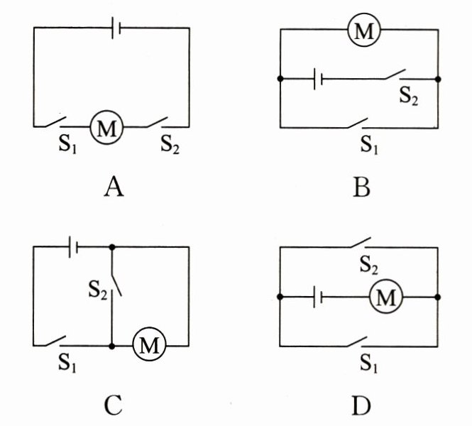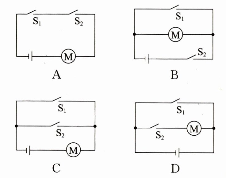 2.(泰安中考)小文同学家安装了密码门锁,能通过输入密码($S_1$)或利用钥匙($S_2$)单独驱动电动机工作而打开门锁。下列电路设计符合要求的是 (