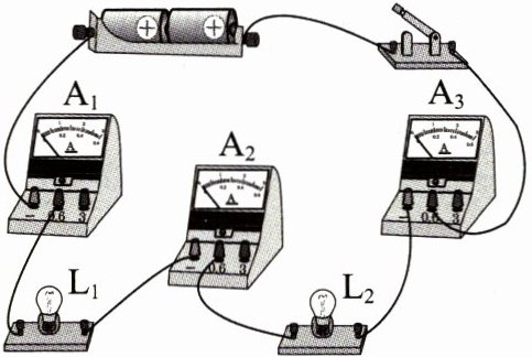 (2)把电流表分别接入$A$、$B$、$C$三点,如图所示,检查电路无误后闭合开关,读出电流表的示数,记录在表格中。