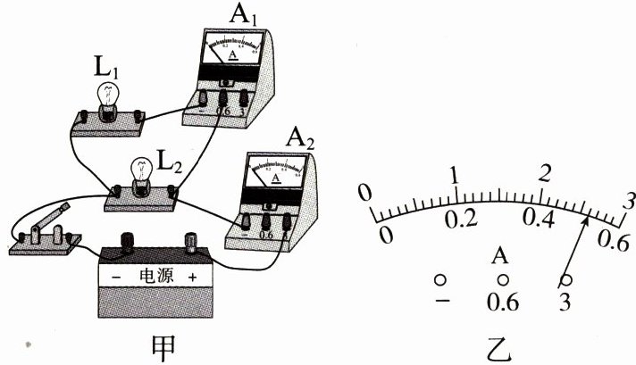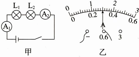 2. 图甲是探究串联电路中的电流关系的电路图,开关闭合后电流表$A_{1}$的示数如图乙所示。电流表$A_{2}$的示数应是