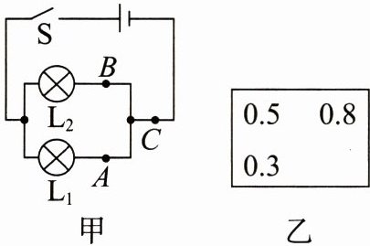 4. 图甲是小刚同学探究并联电路的电流规律时的电路图。实验中他用电流表分别测出$A$、$B$、$C三处的电流I_{A}$、$I_{B}$、$I_{C}$,但没有及时将数据整理到相应表格中而是随手记录到了草稿纸上,如图乙。已知通过$L_{1}的电流小于L_{2}$的电流,则$I_{A}= $