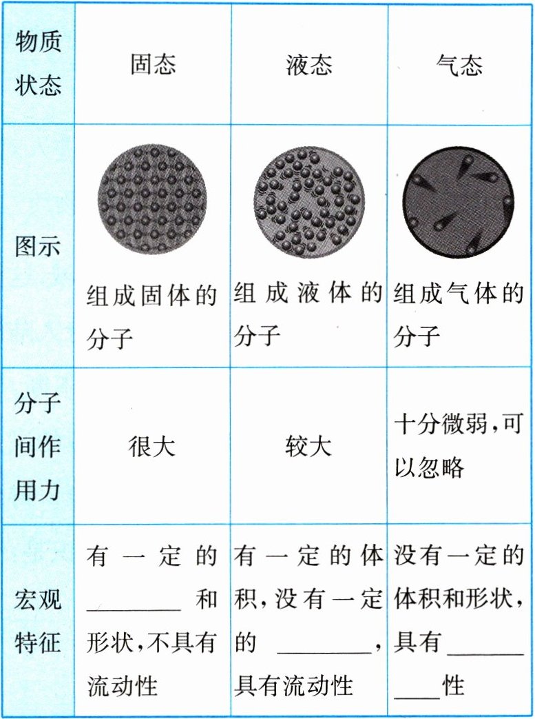 |图示| 组成固体的分子| 组成液体的分子| 组成气体的分子|