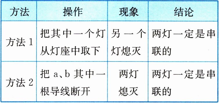 |方法 2|把 a、b 其中一根导线断开|两灯熄灭|两灯一定是串联的|