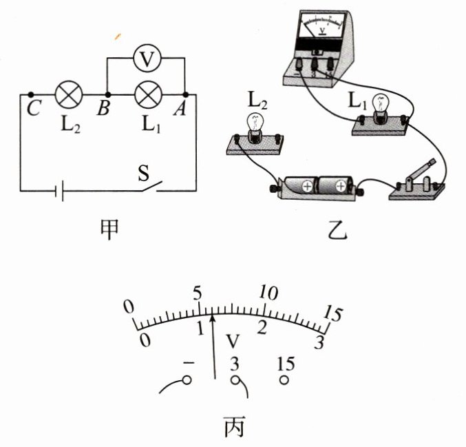(3)用电压表分别测出电压$U_{AB}、$$U_{BC}和U_{AC}。其中测U_{AB}$时,电压表的示数如图丙所示,示数为