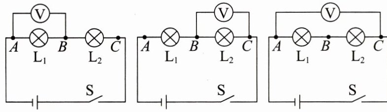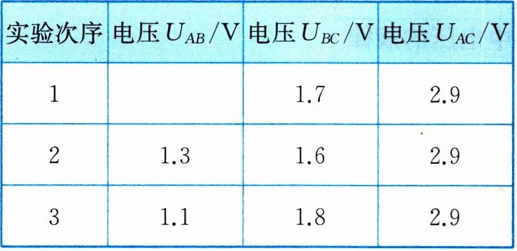 V。接着更换不同规格的灯泡并多次实验,数据记录如下表所示。| 实验次序 | 电压$U_{AB}/V $| 电压$U_{BC}/V $| 电压$U_{AC}/V $|