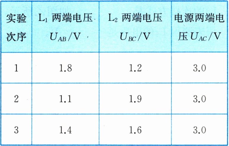 | 实验次序 | L₁两端电压$U_{AB}/V $| L₂两端电压$U_{BC}/V $| 电源两端电压$U_{AC}/V $|