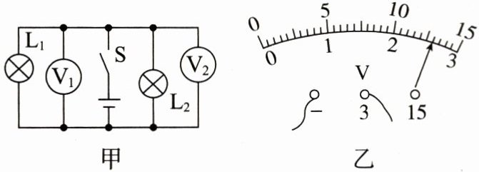 3. 图甲所示电路中,闭合开关S后,电压表$V_1$的示数如图乙所示,则电压表$V_1$的示数为
