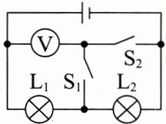 2. 如图所示的电路,当$S_1$闭合、$S_2$断开时,电压表的示数为2.5 V;当$S_1$断开、$S_2$闭合时,电压表示数为6 V,则灯$L_2$两端的电压为