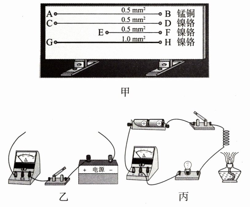 4. 如图丙所示,把电阻丝接入电路,慢慢地给电阻丝加热,观察电流表示数的变化情况。