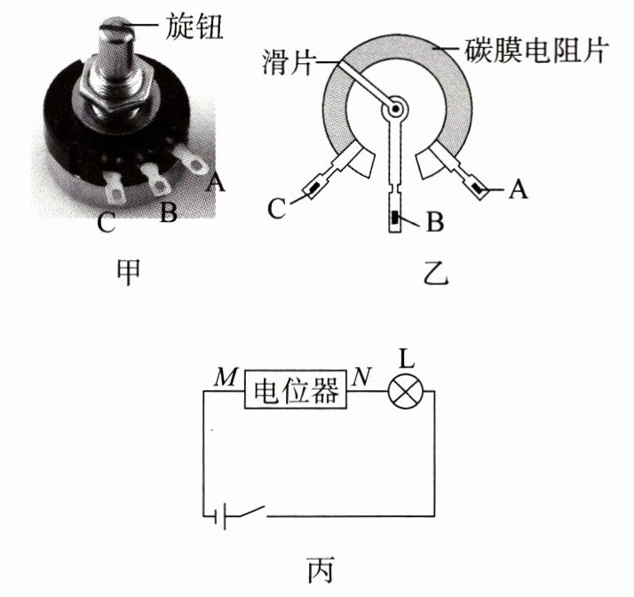来改变电阻的。结合图甲和图乙,若要实现顺时针转动旋钮(滑片在电阻片上同向滑动),台灯变亮,则图丙电路中M连接B接线柱,N连接A