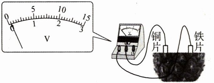 1. 将铜片和铁片插入菠萝中,制成一个水果电池。用电压表测量这个水果电池的电压,电压表示数如图所示。下列说法正确的是(