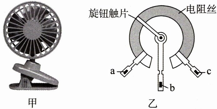7. 图甲是一种可调转速的小风扇,图乙为其用于调转速的电位器结构图,$a$、$b$、$c$是它的三个接线柱,$a$、$c$分别与弧形电阻丝的两端相连,$b$与旋钮触片相连。若要使旋钮顺时针旋转时风扇转速变大,则应将接线柱