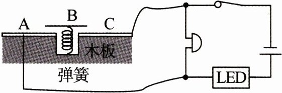 8. 具有报警功能的文物展示台如图所示,该展示台由木板,弹簧,金属片$A$、$B$、$C$和报警电路组成。物品被搬离展示台后,金属片$B在弹力作用下与金属片A$、$C$分开,电铃发出警报。金属片$B$和弹簧相当于电路中的