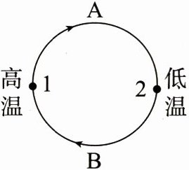 1821年,科学家塞贝克发现:把两种不同的金属导线连接成闭合电路,如果把导线的两个连接点分别放在温度不同的两个环境中,电路中就会有电流产生。这种现象称为塞贝克效应。如图所示,两种金属导线$A$、$B$连接成金属环,$1$、$2$为两个连接点,连接点$1$处环境温度高,连接点$2$处环境温度低,在金属环中产生了顺时针方向的电流。不同属性的两种金属才会产生塞贝克效应,同种金属不会产生,根据塞贝克效应可以制成温差电池。
