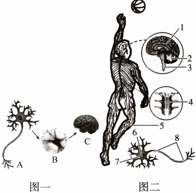 (3)如图二所示,在赛场上,运动员从看到篮筐到准确完成投篮的过程中,对投球角度、力度作出准确判断的结构是[ ]______;与维持身体平衡、协调运动有关的结构主要是[ ]______。