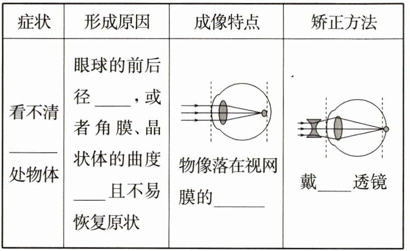 |看不清______处物体|眼球的前后径______,或者角膜、晶状体的曲度______且不易恢复原状|物像落在视网膜的______|戴______透镜|