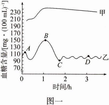 14. 2 型糖尿病是指人体不能有效利用胰岛素,从而出现血糖水平持续升高的疾病。正常人空腹血糖为 70~99 mg/100 mL,糖尿病患者的空腹血糖大于 126 mg/100 mL。图一是糖尿病患者和正常人的血糖含量的变化曲线。请分析回答下列问题。