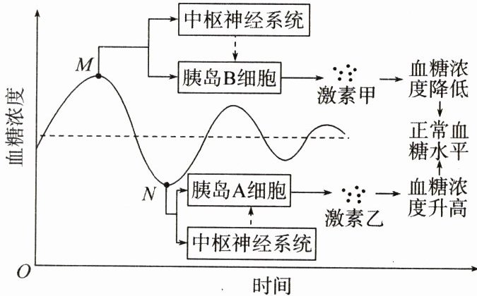 C 解析:由图可知,进食后血糖升高,胰岛B细胞分泌的激素甲能使血糖浓度降低;一段时间后血糖降低,胰岛A细胞分泌的激素乙能使血糖浓度升高;饭后血糖升高,胰岛素会及时调节糖代谢,使血糖浓度维持在正常水平,当人体内胰岛素分泌不足时,尿液中会检出葡萄糖;胰岛A细胞和胰岛B细胞的分泌活动都受中枢神经系统的调节。