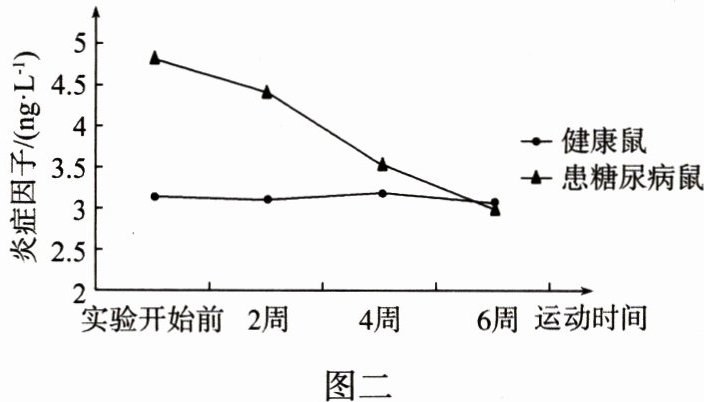 (3)研究发现:骨骼肌中过多的炎症因子会抑制血液中的葡萄糖进入组织细胞。运动一直被认为是治疗和预防 2 型糖尿病的一种重要方法。运动与骨骼肌中炎症因子的浓度是否有关呢?为此,某科研小组用大小及患病程度基本相同的 20 只糖尿病鼠和 20 只健康鼠进行了相关实验,在运动的第 2、4、6 周分别测定了健康鼠和患糖尿病鼠骨骼肌中炎症因子的浓度,实验结果如图二所示。