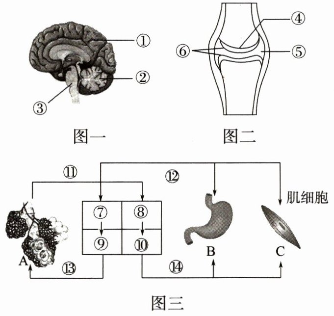 19. 2024年8月30日,巴黎残奥会男女混合4×50米自由泳接力20分项目决赛举行,我国运动员以2分14秒98的成绩获得金牌,并创造了该项目新的世界纪录。图一是人脑结构图,图二是关节示意图,图三是人体循环路线图,请据图回答下列问题。
